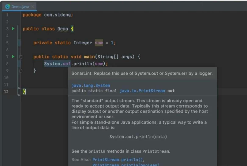 如上面这种场景,插件提示不要用 System.out 输出,要用 logger 日志类进行输出,诸如此类,帮助我们提升代码质量。
